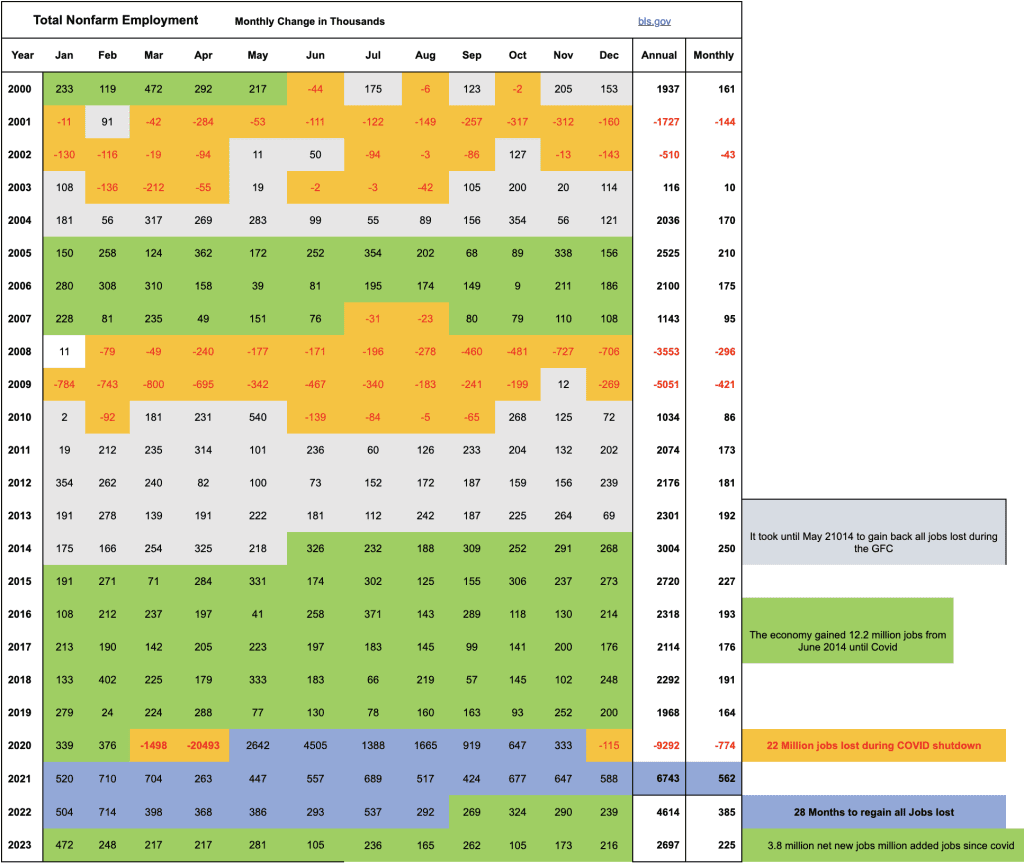 The US economy added 2.7 million jobs in 2023. That’s a net gain of 3.8 million since the beginning of covid. Additionally, the US economy has added a net 25.8 million jobs since the turn of the century.