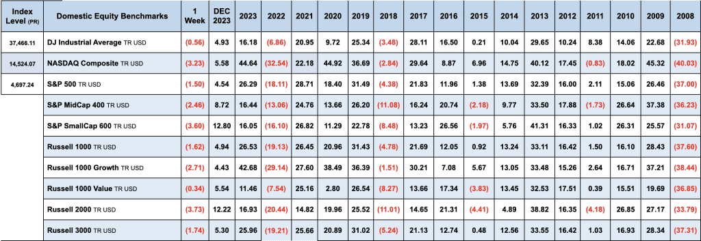 The minutes from the December FOMC meeting were perhaps not as dovish as hoped, highlighting the gap between Fed signaling and the market’s aggressive rate-cut expectations. There were some cautious earnings-related stories that raised some anxieties about the Q4 earnings season to come. And geopolitics remained a threat on the fringes, with continued dangers to Red Sea shipping and a deadly bomb blast in Tehran kept fears of a widening Mideast war alive. In short, conditions were favorable for a period of digestion after a long market rally.