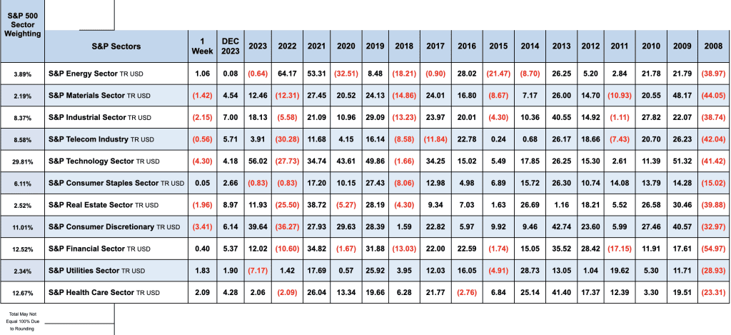 The Magnificent Seven names were all lower. The big corporate story for the week was the slide in Apple (5.9%), which faced downgrades from Barclays and Piper Sandler along with news the Justice Department is finalizing its antitrust case against the company.