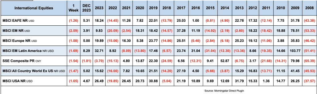 US equities were lower in the first week of the new year, with the S&P and Nasdaq declining after nine straight weeks of gains. The “Santa Claus” period (the final five sessions of December and the first two in January), which has seen the S&P rise nearly 80% of the time, this round ended with an S&P decline of 0.9%.