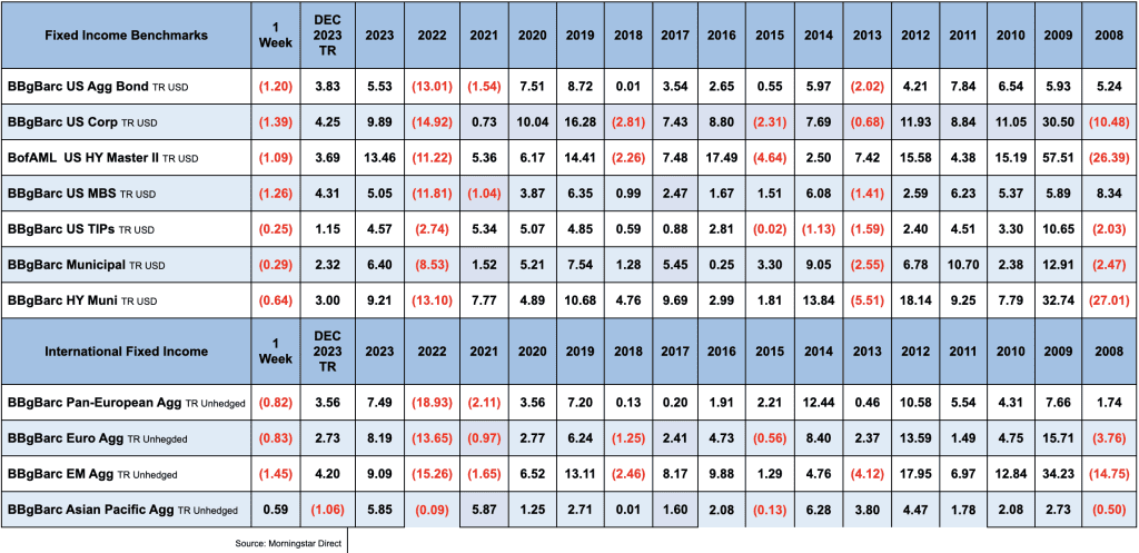 Treasuries were weaker across the curve, with the 10Y moving back above 4% for the first time since mid-December. The dollar was better on the major crosses gaining +1.1%, its best week since July. Gold lost ground after capping a big 2023 gain last Friday. Oil was stronger, with WTI crude settling up 3.0%.