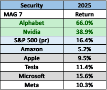 Corporate earnings remained strong in 2025, with FactSet noting forecasts for a 12.1% annual increase for the calendar year, which would be the fifth consecutive year of earnings growth and well ahead of the 10-year average of 8.6%. Earnings for Q1 came in at 13.3% (vs 11.3% expected at the beginning of the quarter), Q2 was at 12.0% (vs 9.2% forecast), and Q3 registered 13.6% (vs 6.8% expected). Big tech companies were a big driver of the overall increase, with NVDA, GOOGL, and AMZN three of the top five contributors to CY25 earnings growth. However, the 493 S&P constituents outside the Magnificent 7 are forecast to ultimately report earnings growth of ~9% for the year.