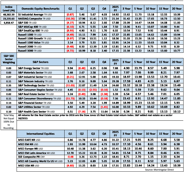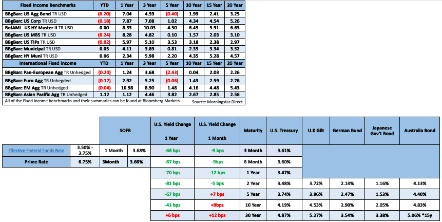 Fixed Income – Fixed income was up across the board in 2025 with the curve steepening. The 2Y yield dropped 77 bp over the course of 2025 and the 10Y yield fell 40 bp, though the 30Y ultimately remained near the 4.80% level, its yield rising 6 bp over the course of 2025. Investors this year voiced some concern about increased federal spending leading to greater note/bond issuance and sparking “bond vigilantes” into action, though the Treasury continued to maintain guidance about coupon sizes remaining stable for the next several quarters. Markets expect the December jobs report to heavily influence rate expectations and growth sentiment as we start 2026.