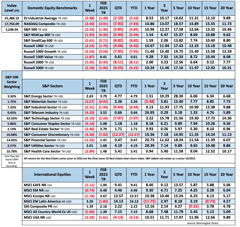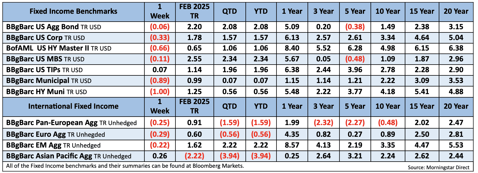 Developments in Washington and geopolitics also received some attention this week. US House approved a continuing resolution authorizing spending through September, a key step to avoiding a government shutdown after the March 14th deadline. Bill increases defense spending and gives White House greater flexibility on spending decisions. Bill still must pass Senate where it faces uncertain fate, though most expect it will ultimately pass amid threat of government shutdown and after Minority Leader Schumer said he would support the measure. Elsewhere, Russian President Vladimir Putin on Thursday offered preliminary support for a 30-day ceasefire in Ukraine proposed by the United States and Ukraine earlier this week. Though Russia noted many details still need to be worked out that address the “root cause” of the conflict.