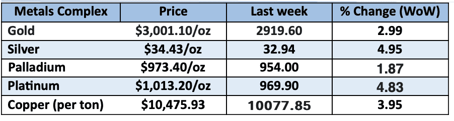 Although Friday stocks jumped higher, one good day could not turn the week around. Declines were broad-based with very few places to hide in equities. Big tech was a drag though fared better compared to last week, Energy and Utilities were the only sectors higher on the week. Treasuries were mostly firmer. Thedollar index was down 0.1%. Bitcoin futures were down 2.7%. Gold was up 2.9%, breaking above $3,000/oz for the first time. WTI crude was down 0.7%, logging its eighth straight weekly decline, longest losing streak since 2015.