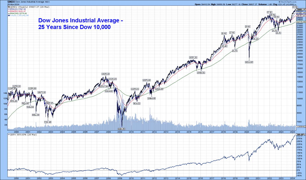 Friday marked the 25th anniversary of the Dow Jones closing above 10,000 for the first time ever. Including the “lost decade” of 2000 – 2009, the 25 year return is a little over 300%.
