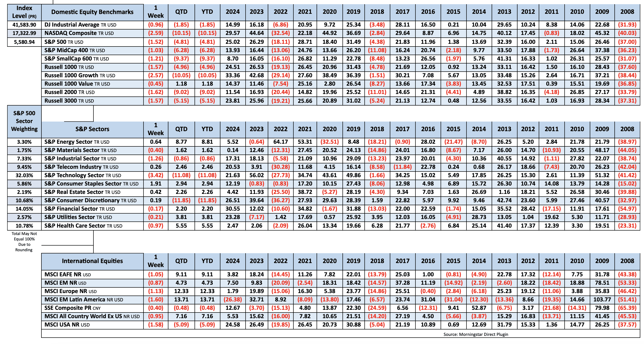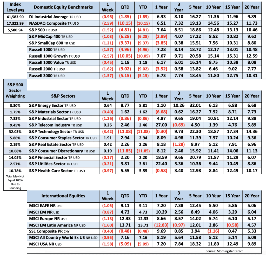 Stocks were again lower last week with S&P 500 back near correction territory after eking out modest gains the week prior. Declines were somewhat broad-based though Equal-Weight S&P Index outperformed official one by ~35bp. The Mag 7 was mostly lower with Tesla the standout higher. Treasuries were mostly firmer with yield curve steepening. Dollar Index was down 0.2%. Bitcoin futures were up 0.3%. Gold was up 3.1%, further into record territory. WTI crude was up 1.6%, its third consecutive weekly gain.