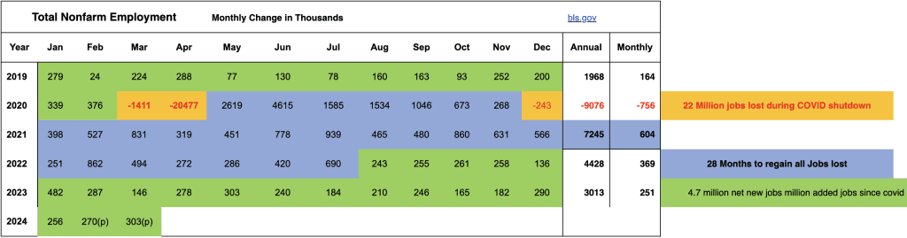 February Jobs Report – BLS Summary– Released 4/5/2024 – The US economy added 303k nonfarm jobs in March and the Unemployment rate decreased 0.1% to 3.8%. Average hourly earnings increased 12 cents to $34.69. Hiring highlights include +72k Healthcare, +71k Government, +49k Leisure and Hospitality, and +39k Construction.