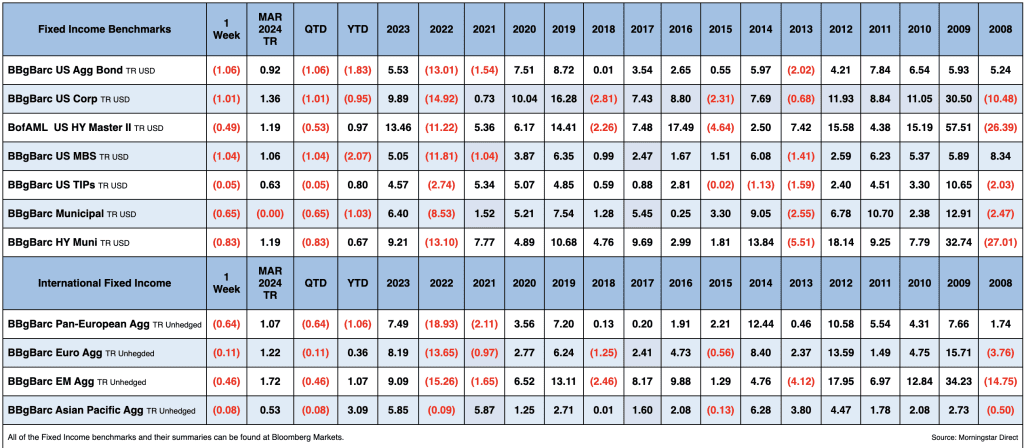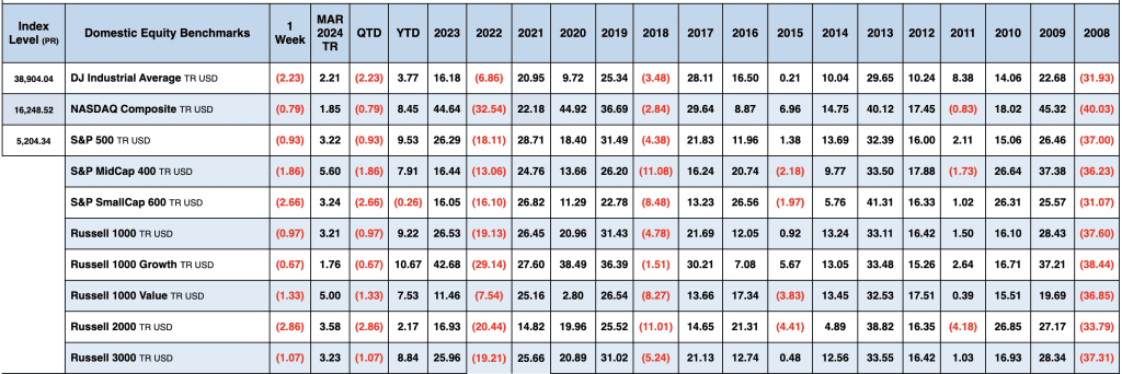 Major US equity indices were down for the week, though helped by a solid post-NFP gain on Friday. Growth/momentum factors were relative outperformers while value lagged. Treasuries were notably weaker with the curve steepening amid the week’s mixed economic data and Fedspeak hinting at some lack of urgency about rate cuts.