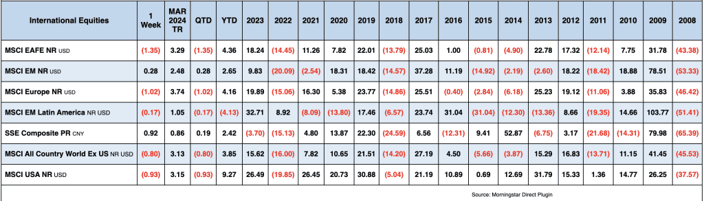Treasury yields rose to their highest levels this year. Firmer economic data (particularly a strong March jobs report and a hotter-than-expected ISM manufacturing reading) and in combination with some Fedspeak that pushed out the first rate cut, drove yields higher.