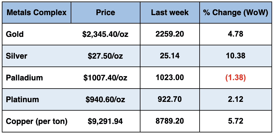 Gold +4.8% notched its best week since October, pushing above $2,300/oz and even farther into record territory.