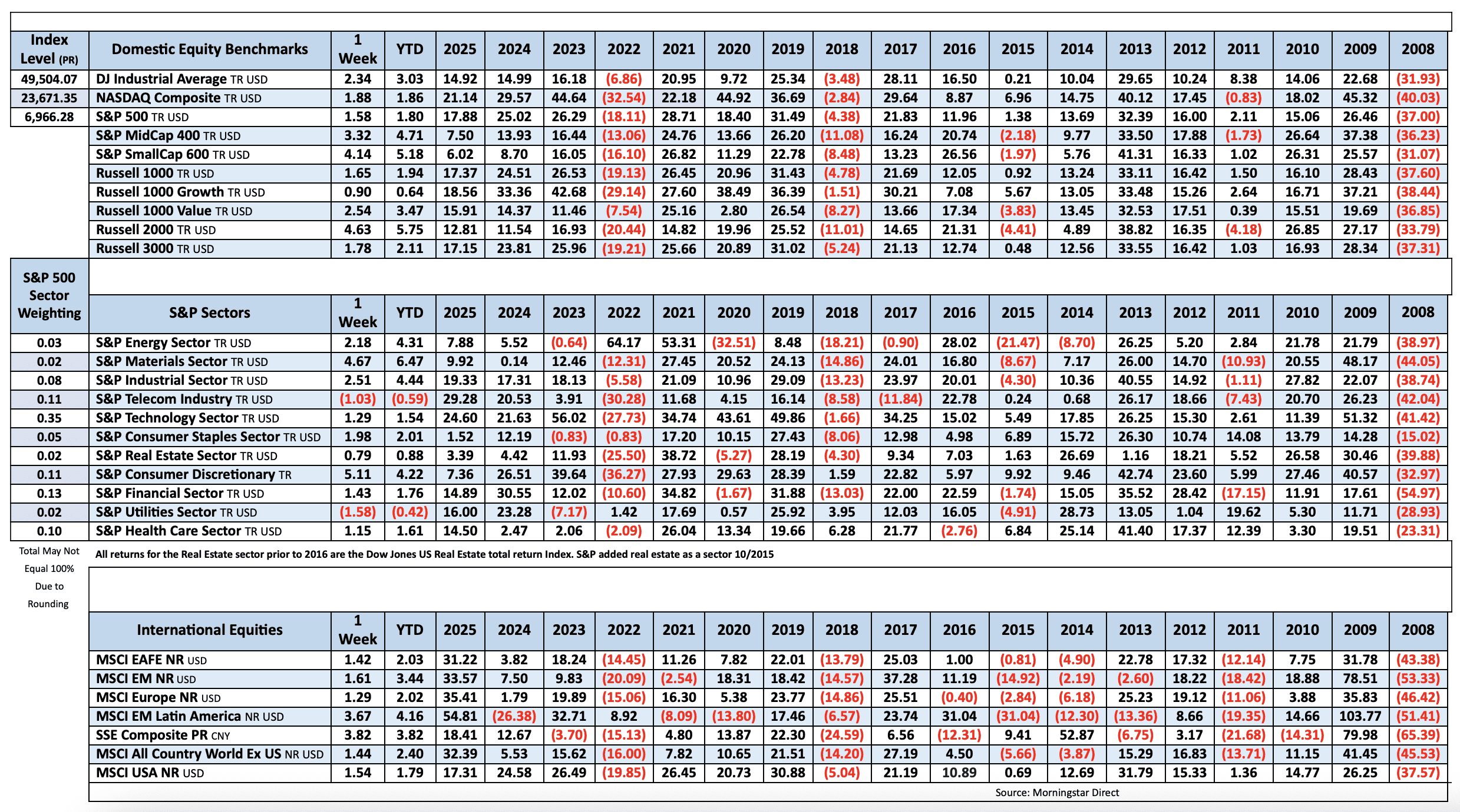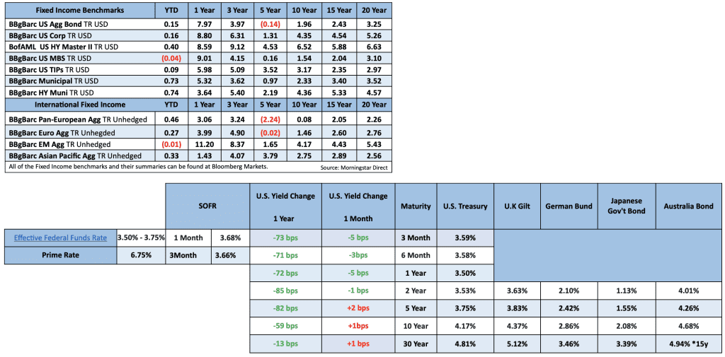 Fixed Income – Bond markets were constructive overall. Core domestic bonds posted gains last week, with yields modestly lower after early pressure. Money market flows surged, indicating a pivot toward liquidity and near‑term protection. Federal Reserve policy remains central to positioning: Markets price a steady policy path with the possibility of 1–2 rate cuts in 2026, but upcoming inflation prints (CPI) are a key focus and could delay easing if inflation surprises higher.