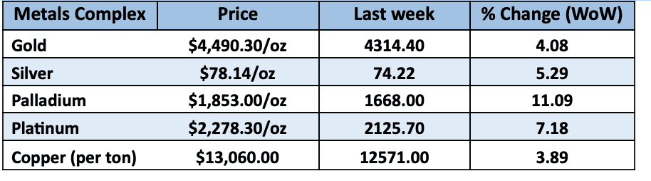 Metals Complex – Gold, silver, and related metals posted significant weekly gains, supported by geopolitical risk and annual rebalancing flows. They also continue to reflect safe‑haven demand, with some industrial metals also tracking broad economic sentiment.