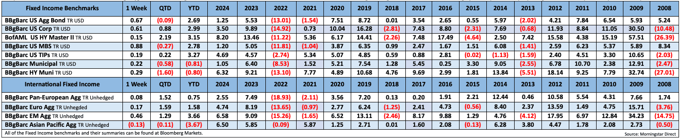 Fixed Income:  – Yields whipsawed by data and geopolitics but overall lower on the week, as investors balanced benign domestic data against an oil-driven inflation scare. The European Central Bank’s latest rate cut delivered its eighth consecutive cut, lowering the deposit rate by 25 bps to 2.00% as inflation nears the 2% targetajg.com. However, gains moderated later in the week after ECB President Christine Lagarde signaled the end of the easing cycle may be near, preparing markets for a possible pause in July.