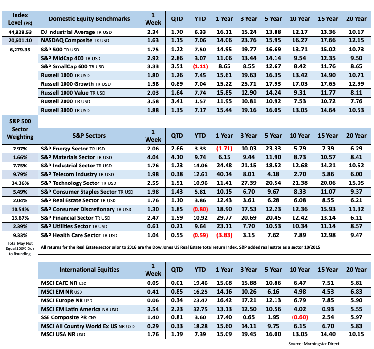 Equities were higher again for the holiday-shortened week, with the S&P and Nasdaq both hitting fresh record closes on Friday. Markets saw some rotation out of Q2’s top performers, with momentum factor lagging and value stocks having a good week. Treasuries were weaker with the curve flattening; 2Y yields jumped sharply on Friday after June’s solid nonfarm payrolls report. The dollar was slightly weaker overall. At Thursday’s stock-market close, gold was up 1.7% for the week. WTI crude was up 2.1%, rebounding a bit after the prior week’s 11.3% drop.