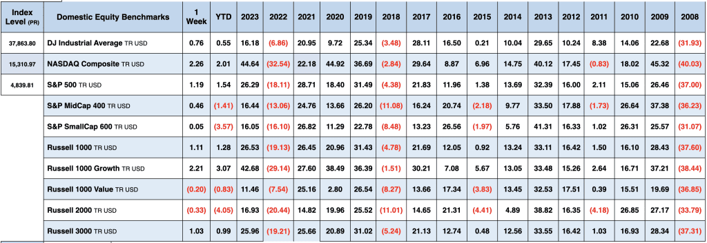 US equities were mostly higher for the holiday-shortened week, with the Dow, S&P, and Nasdaq gaining but small-caps continuing to struggle in 2024 (Russell now down four consecutive weeks). The S&P on Friday set a new all-time closing high near 4840. Market leadership was narrow with tech driving the upside; the equal-weight S&P logged a weekly decline.