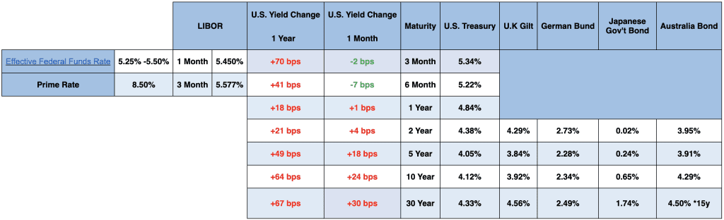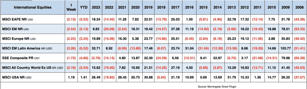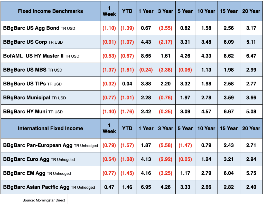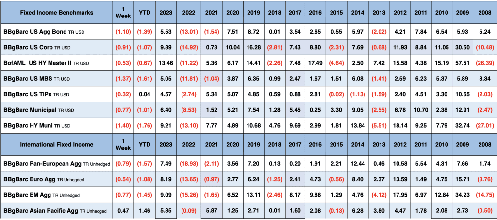 Treasuries were weaker with a bit of curve flattening; the 10Y yield pushed back well above 4%. The dollar was higher after a flat performance in the prior week, with the greenback having strong performance on the yen cross. Gold was down 1.1%, continuing its difficult start to the year. Oil was somewhat higher, with WTI crude settling up 0.8% after dropping in the prior week’s trading.