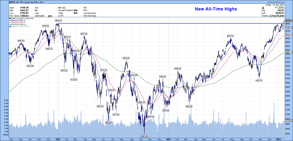 It took two years but the S&P 500 made new closing all-time highs. The S&P added 1.25% on Friday, closing at 4839, higher than its Jan 2022 close. The Dow Jones also closed at new highs but the Nasdaq composite and Russell 2000 still have a ways to go.