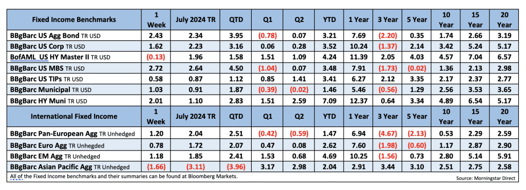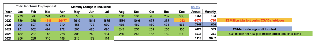 June Jobs Report – BLS Summary–Released 8/2/2024– The US Economyadded 114k nonfarm jobs in July and the Unemployment rate increased 0.2% to 4.3%. Average hourly earnings increased 8 cents to $35.07. Hiring highlights include +55k Healthcare, +25k Construction, and +14k Transportation and Warehousing.