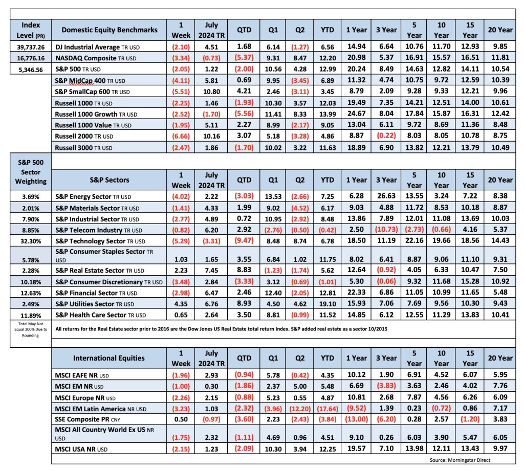 Last week saw sentiment move decidedly negative with a focus on growth and recession concerns amid a stream of weak employment and manufacturing data punctuated by Friday’s nonfarm payrolls miss and spike in unemployment. Boost in Fed rate cut expectations did little to quell growth fears and emerging “bad news is bad news” narrative. Other overhangs this week included some disappointing earnings (pointing to weak consumer), geopolitical tensions in the Middle East, US election uncertainty, enhanced AI scrutiny, systematic selling pressure, and negative seasonality.