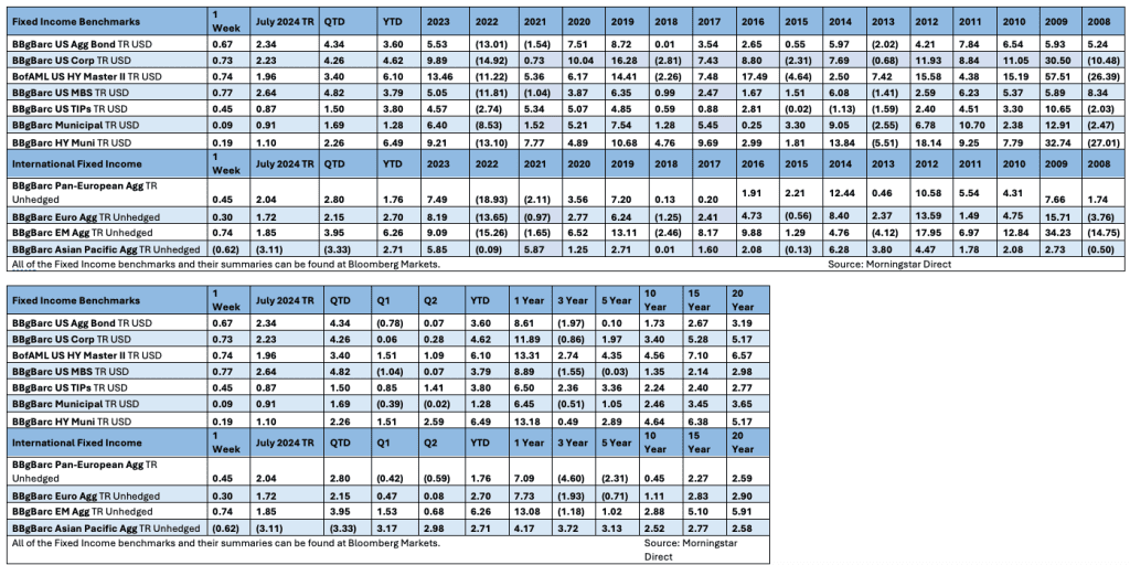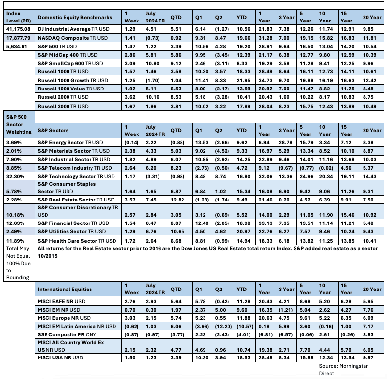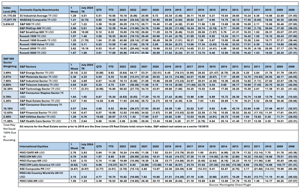 The equal-weight S&P outperformed the market weight index and closed Friday at a new all-time high. Small caps also rallied and are near all time highs once again. Treasuries were firmer across the curve amid Fedspeak consistent with consensus expectations for a September start to a rate-cut cycle. The 2Y yield ended back below 4% with the inverted 2/10 spread again moving a bit back toward flat. The DXY dollar index was down 1.7%, its fifth straight weekly decline and the seventh week down of the past eight. Gold was slightly higher, rising 0.3% for the week and while setting fresh record highs. Despite a Friday bounce, WTI crude settled down 0.9% for the week, logging its fifth decline of the prior six weeks amid Gaza ceasefire headlines and continued China growth concerns.