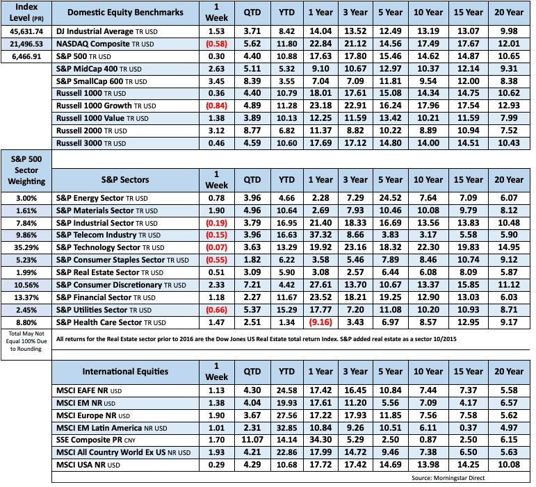US equities were mostly higher this week, as the S&P 500 edged out a slight gain to finish higher for a third-straight week, but the tech-heavy Nasdaq was lower for the first time in three weeks. Small caps also rallied again, outpacing the S&P 500 by over 3% and posting its best week since early July and the Dow hit a new all-time high Friday afternoon. This week’s S&P Global flash PMIs were stronger than expected, with manufacturing the highest in more than three years, while services ticked lower but came in better than expected. The report also noted hiring rose at the fastest pace in over three years. Some fears around debt and deficits were ameliorated by S&P reaffirming its US credit rating, noting tariff revenue is offsetting some of the deficit impact from OBBA, while CBO estimated tariffs could cut US deficits by $4T over the next decade, offsetting the $4.1T impact from the OBBA .