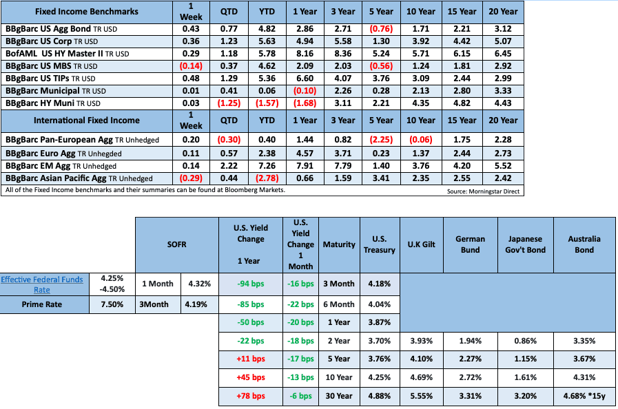 Fixed Income:  –   Treasury yields fell across curve (notably 2y and 10y), sparking rallies in IG credit. Global yields were modestly lower or stable.