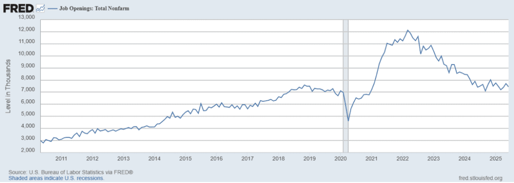 Job Openings & Labor Turnover Survey JOLTS – Released 7/29/2025 – The number of job openings fell 400k at 7.4 million in June, the U.S. Bureau of Labor Statistics reported. Over the month the number of hires and total separations was little changed at 5.2 million and 5.1 million, respectively.