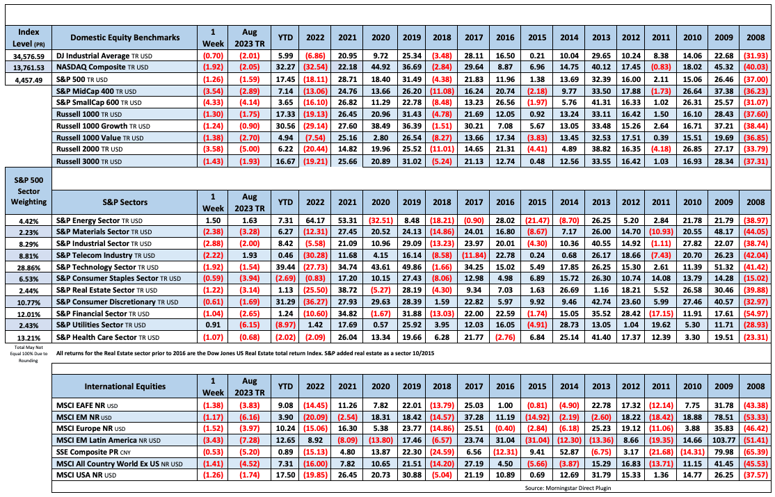Several other factors also weighed on equities this week. Oil strength driven by Russian and Saudi production-cut announcements (and looking past recent concerns about the resilience of China demand) raised the specter of further inflationary pressures. There were some cautious details in Fed’s latest Beige Book report, including notes about slowing retail spending ex autos, higher delinquencies on consumer credit lines, and thoughts that spenders may have exhausted pandemic savings. Continued strength in the dollar played into the narrative of tighter financial conditions. And the high-profile sparring between major automakers and the United Auto Workers union ahead of next week’s contract deadline clouded the market’s mood.