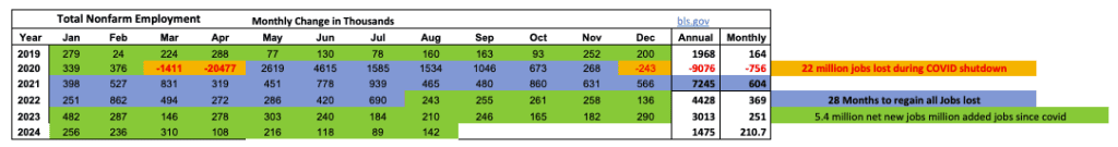 August Jobs Report BLS Summary Released 9/6/2024 – The US Economyadded 142k nonfarm jobs in August and the Unemployment rate decreased 0.1% to 4.2%. Average hourly earnings increased 14 cents to $35.21.  Hiring highlights include +31k Healthcare and +34k Construction.