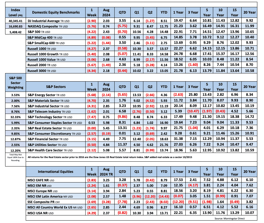 Job Openings & Labor Turnover Survey JOLTS – Released 9/4/2024 – The number of job openings was little changed at 7.7 million on the last business day of July, the U.S. Bureau of Labor Statistics reported. Over the month the number of hires and total separations was little changed at 5.5 million and 5.4 million, respectively. Within separations, quits (3.3 million) and discharges (1.8 million) changed little.