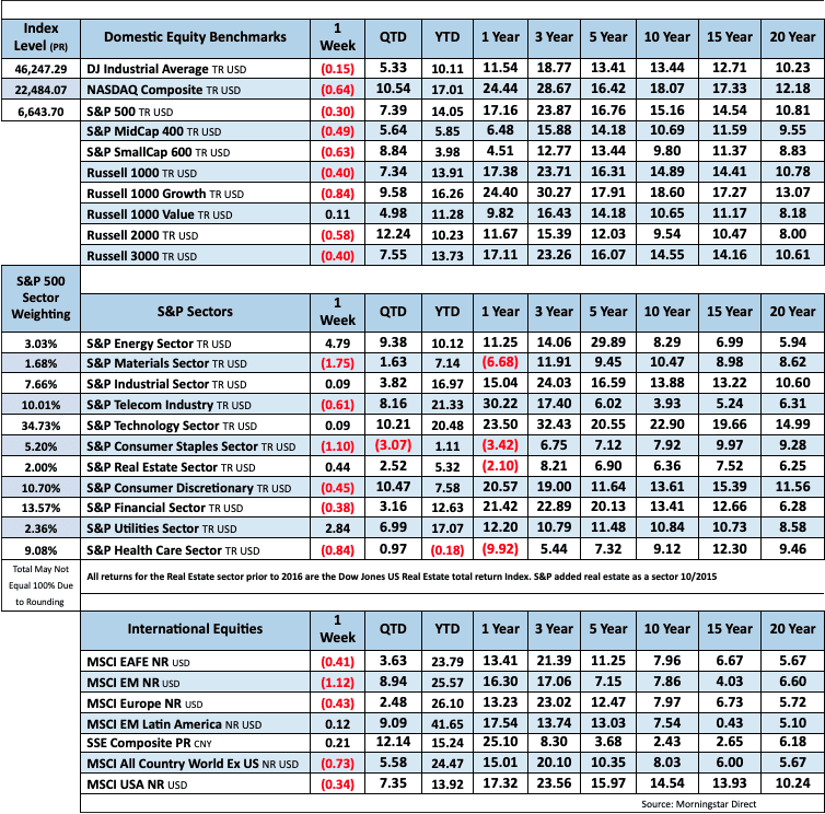 Major US equity indices finished lower this week, but came off worst levels in broadly higher Friday trading. The S&P 500 and Nasdaq Composite were down after three consecutive weekly gains; each saw their worst weekly performance since 1-Aug. Equities took a breather this week after their recent strength (the Dow, S&P, and Nasdaq set fresh all-time highs as recently as Monday), with the path of least resistance seeming to shift to the downside.