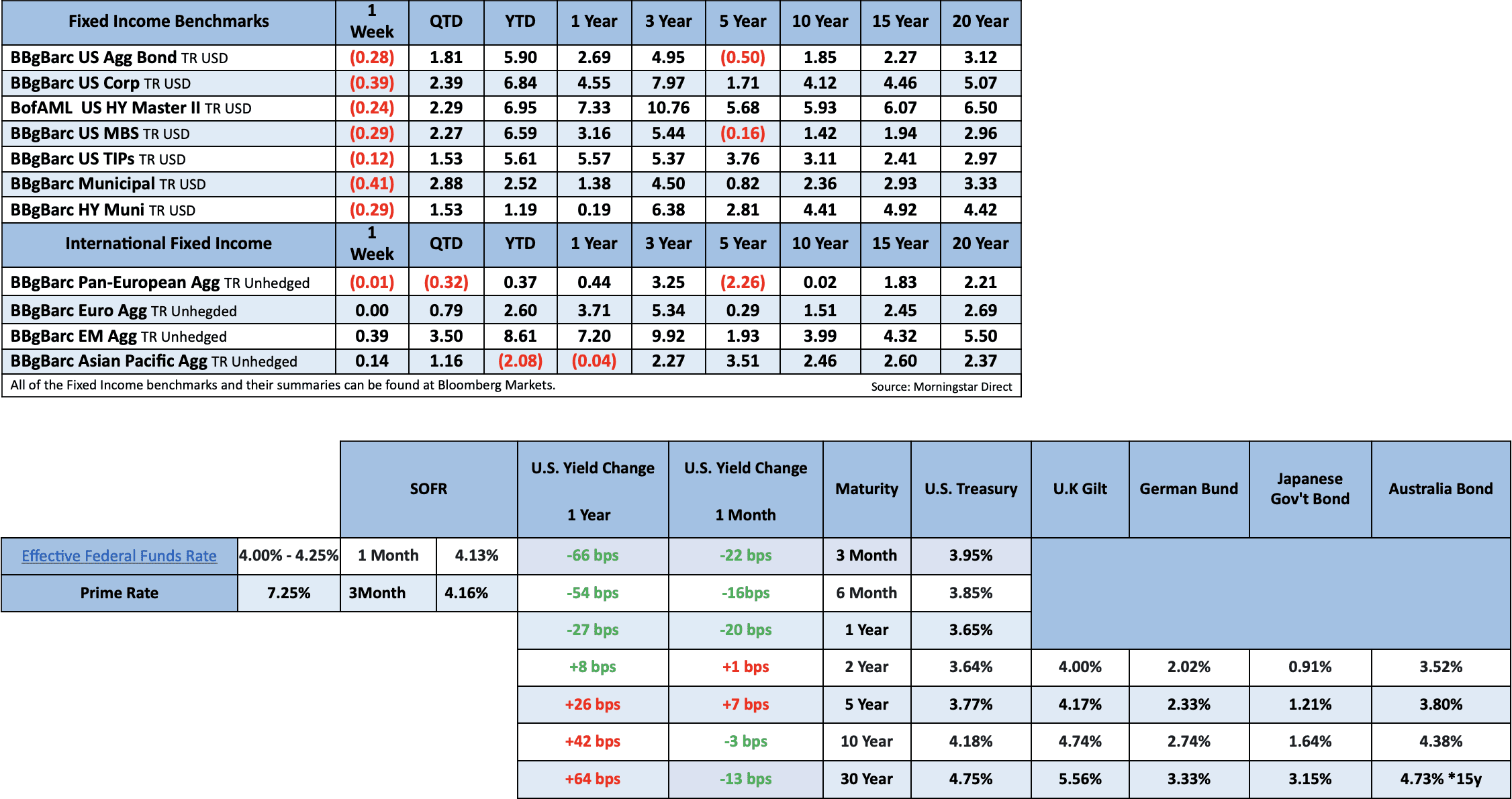 Fixed Income: Treasury yields edged up across the curve with a steepening bias after the Fed cut, credit spreads compressed further into multi‑decade lows amid robust issuance and fund flows, Investment Grade OAS (option adjusted spreads) tightened to 72 bps (multi‑decade low) while high yield OAS settled at 2.76%