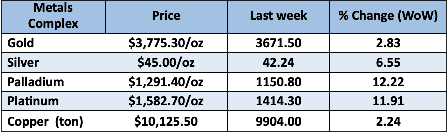 Metals Complex – Gold logged a 5th straight weekly gain, holding near record territory after the Fed’s 25 bp cut.