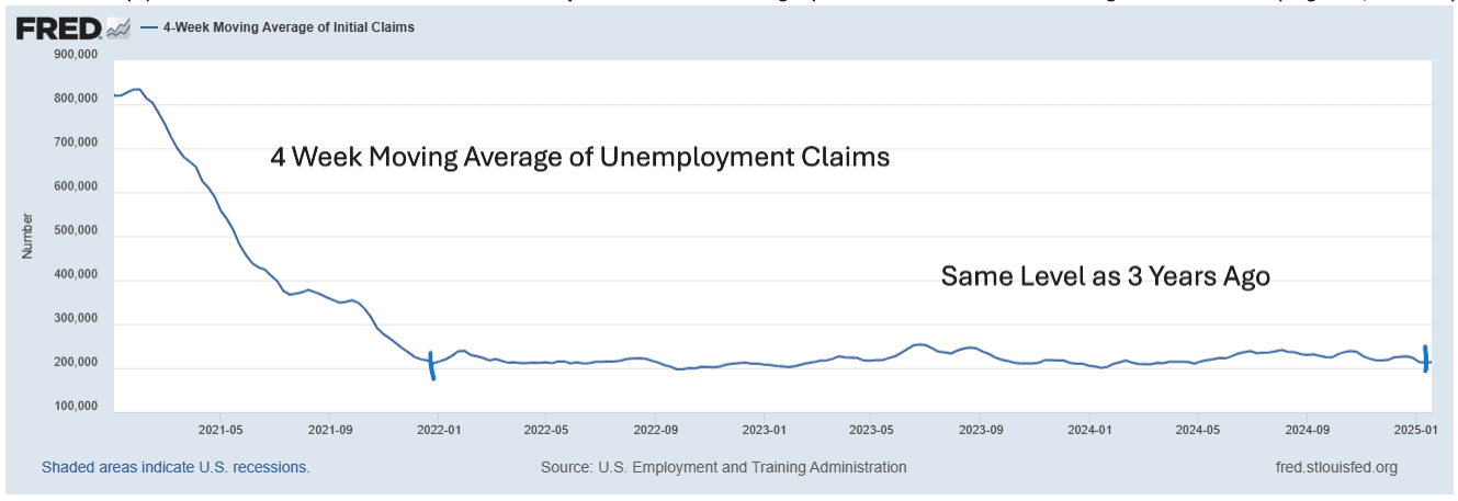 Weekly Unemployment Claims – Released Thursday 1/23/2025 – In the week ending January 18, the advance figure for seasonally adjusted initial claims was 223,000, an increase of 6,000 from the previous week’s revised level. The 4-week moving average was 213,500 an increase of 750 from the previous week’s revised average.