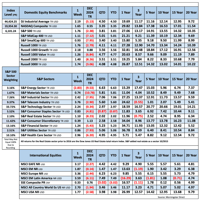 Q4 earnings sentiment has remained fairly upbeat with blended growth rate improving to 12.8% from 11.9% at the end of the quarter. However, Q4 earnings metrics did deteriorate from last week’s elevated levels. So far, 16% of the companies in the S&P 500 have reported actual results for Q4 2024. Of these companies, 80% have reported actual EPS above estimates, which is above the 5-year average of 77% and above the 10-year average of 75%.