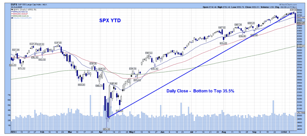 The Friday pullback was tabbed to rising trade and tariff tensions between the US and China. President Trump on social media called out a hostile trade attitude from China relating to their actions on rare earths and export controls. Trump also threatened a massive increase in tariffs on Chinese products along with many other countermeasures, and also said there is no reason for him to meet China’s Xi onthe sidelines of the APEC conference in South Korea later this month. The announcement also came after Beijing recently said it will begin levying fees on US cargo ships docking at its ports, increase customs scrutiny for Nvidia chip imports, and reports of an antitrust investigation into Qualcomm.