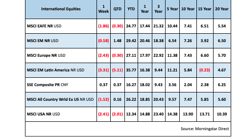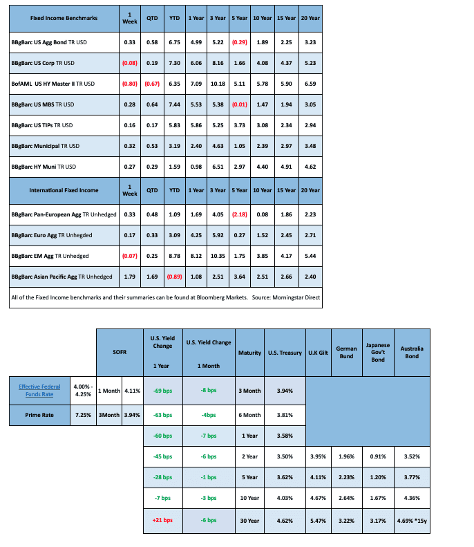 Fixed Income: We got a look at the Fed minutes that came out this week, nothing earth shattering but does provide some color on their thinking. High yield spreads widened this week as treasuries yield fell slightly