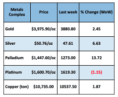 Metals Complex – Gold logged a 7th straight weekly gain, hitting $4.000 an ounce while closing at another all-time high this week. Silver continued higher also.