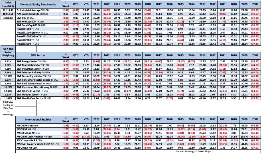 The biggest focus was on yields ticking higher, extending this month’s sizable jump with the 2Y back above 4% and 10Y back to July levels (before the Fed cut by 50 bp in August). The latest Treasury weakness was tabbed to factors including rising Trump/GOP sweep odds given potential deficit and tariff impacts, rising scrutiny over debt/deficit, and more soft/no-landing optimism. This week also saw some cautious corporate takeaways that added some cracks to the resilient consumer and AI secular growth themes. Earnings takeaways also leaned cautious this week, with the percentage of companies beating revenue expectations down 4pp this week, now below the one- and five-year averages. There has also been growing skepticism around China stimulus, which some economists say is unlikely enough to turn the Chinese economy around.