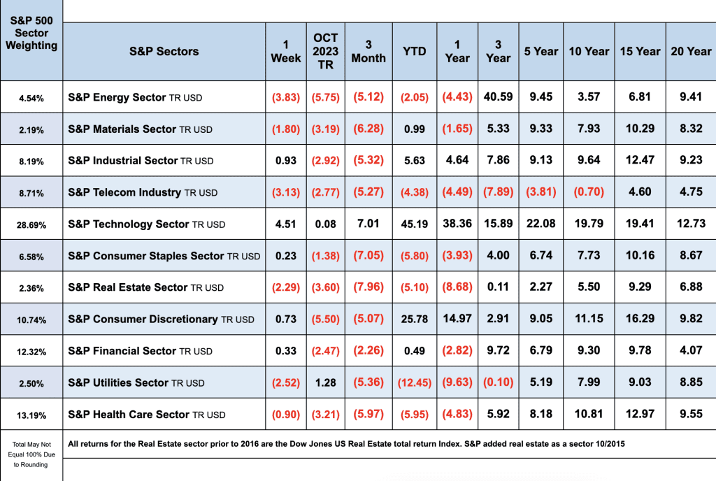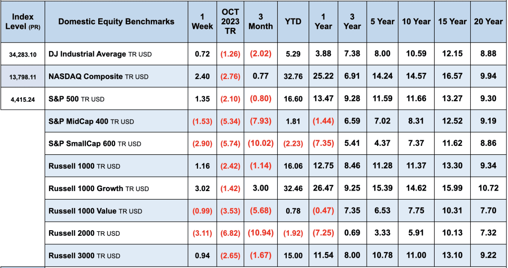 Stocks added on to the prior week’s big gains despite a lack of big stimuli and amid a decelerating Q3 earnings season. Thursday was the only session this week that saw the S&P move lower, with investors that day reacting negatively to some hawkish-leaning commentary from Fed Chair Powell and notably weak demand for a $24B auction of 30-year Treasury bonds.