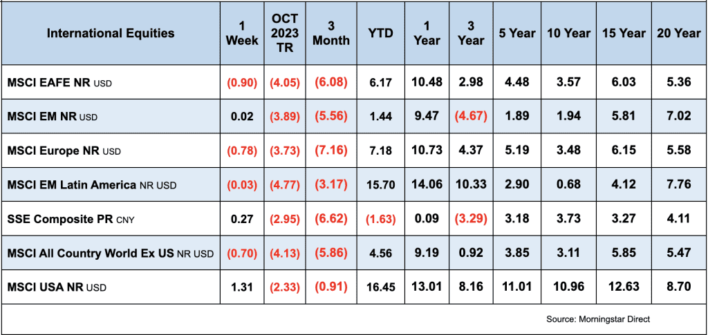 Consumer Confidence – Released 10/31/2023 – Consumer Confidence decreased for the third consecutive month in October to 102.6, down from 104.3 in September. Expectations fell slightly from 76.4 to 75.6. Expectations for the next six months stayed below the recession threshold of 80, reflecting a decline in confidence about future business conditions, job availability, and incomes. More than two-thirds of consumers still said recession is somewhat or very likely in October.