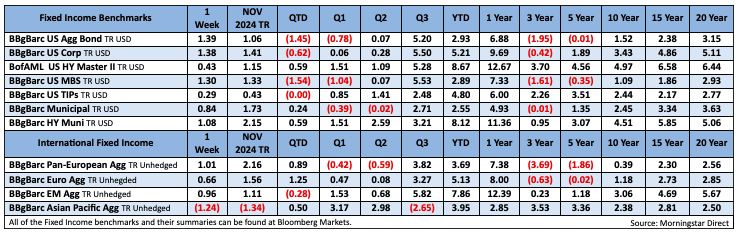 The big tailwind for equities in November was the quick and clear/decisive election outcome that helped foster an unwinding of crowded downside hedges and drove a VIX retracement that also triggered systematic fund buying. The fact that Trump prevailed provided additional support for the post-election move given the animal spirits and deregulation dynamics. In addition, the GOP sweep opened the door for a corporate tax cut that could boost S&P 500 EPS by 4-5%. The removal of the election overhang also put some focus back on very favorable seasonality into year-end and the resumption of (elevated) corporate buyback activity. Positive macro surprise momentum was another bullish talking point for November with the Citi US Economic Surprise Index bumping up against the 2024 highs seen in February. Strong results and upbeat Blackwell launch commentary from NVDA +4.1% provided further support for the AI secular growth theme, while the beat and raise from WMT +12.9% played into the consumer resilience theme. In addition, expectations for low double-digit earnings growth in Q4, which would mark the best performance in three years, held fairly steady. The Street is also looking for earnings momentum in 2025 with all four quarters expected to see double-digit growth. While Trump’s cabinet picks generated some very mixed reactions, the Treasury Secretary pick (Bessent) that mattered most for the market was very well received