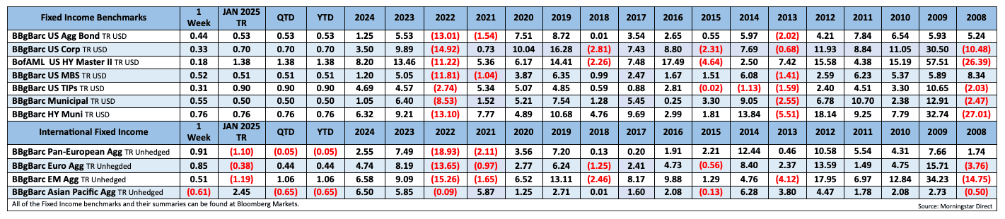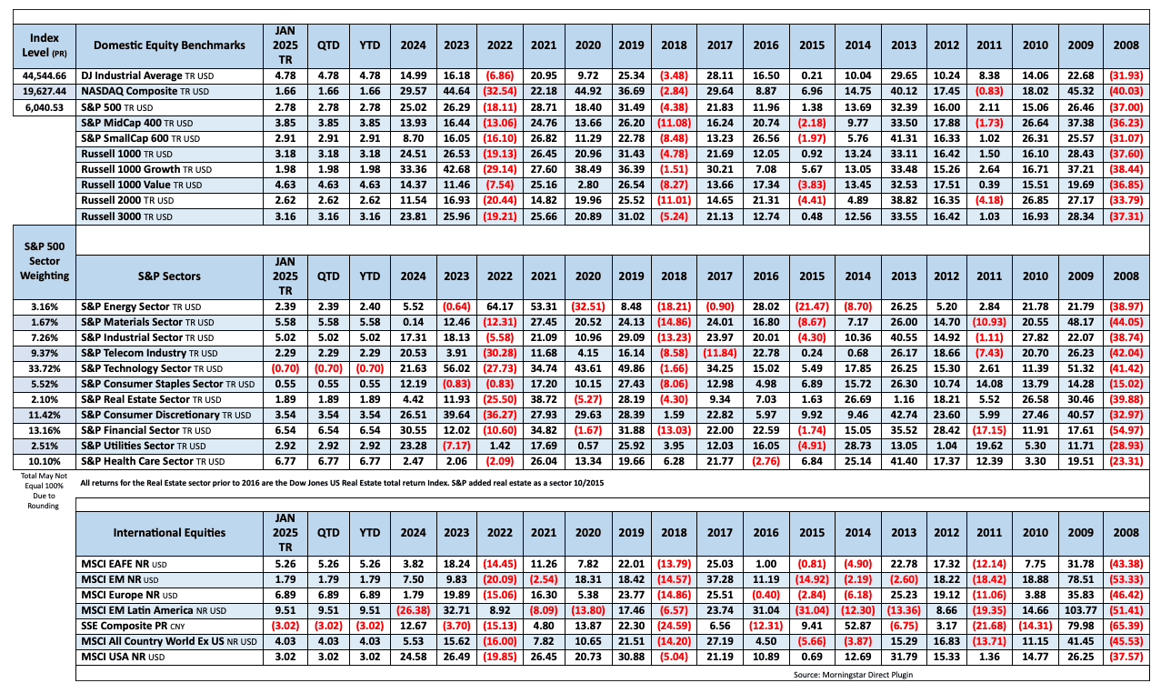 Developments out of Washington dominated headlines this month with President Trump beginning his new term. Market continued to benefit from animal spirits and deregulation dynamics (along with favorable late-January seasonality. Strong corporate buybacks, and some rate reprieve), however, notable uncertainty remains around tariffs (though so far analysts notetariff actions have largely not materialized yet with no immediate implementation following his inauguration). Trump did threaten to slap 25% tariffs on Colombia over a migrant dispute though ultimately backed off after Colombia acquiesced. Still, news reports indicated Trump aides want to hit Mexico and Canada with 25% tariffs as soon as 1-Feb and 10% against China. Additionally, Trump flagged tariffs on chips, steel, aluminum and copper in near future and noted he has not settled on a universal tariff rate, though commented it will be “much bigger” than initial 2.5% Treasury Secretary Bessent reportedly favored. Beyond tariffs, there is still no clear GOP consensus on how to pay for Trump’s tax cuts, with hardliners pushing for deficit reduction and others concerned that such an approach could harm constituents.
