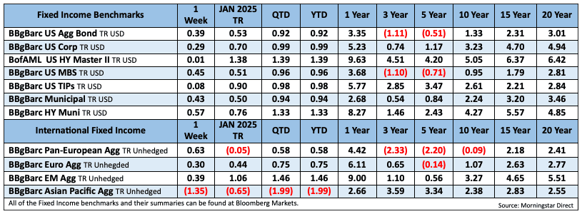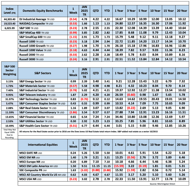 Employment Cost Index – Released 1/31/2025 – Compensation costs for civilian workers increased 0.9% for the 3-month period ending in December 2024. Wages and salaries increased 0.9% and benefit costs increased 0.8% from September 2024. The 12-month period ending in December 2024 saw compensation costs increase by 3.8%. The 12-month period ending December 2023 increased 4.2%. Wages and salaries increased 3.8 percent over the 12-month period ending in December 2024 and increased 4.3 percent for the 12-month period ending in December 2023. Benefit costs increased 3.6 percent over the 12-month period and increased 3.8 percent for the 12-month period ending in December 2023. This report is published quarterly. December Jobs Report – BLS Summary – Released 2/7/2025 – The US Economy added 143k nonfarm jobs in January and the Unemployment rate declined to 4.0%. Average hourly earnings increased 17 cents to $35.87. Hiring highlights include +44k Healthcare, +34k Retail Trade, +32k Government, and +22k in Social Assistance.