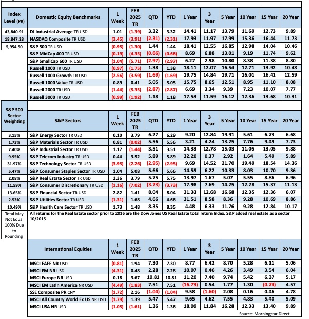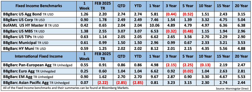 Trade war developments dominated headlines this month with President Trump announcing on 1-Feb 25% tariffs on Canada and Mexico and 10% on China. However, tariffs were ultimately delayed pending negotiations. Bloomberg reported White House has not actually made final decision on tariffs though Trump announced Thursday March 4th date for Mexico and Canada tariffs, said April 2nd date for reciprocal tariffs remains in force, and said China will be charged an additional 10% tariff as of that date. Analysts continued to flag negative growth implications Trump’s trade and immigration policies may have along with potentially inflationary impacts. February consumer confidence reinforced this, registering biggest decline since August of 2021 with commentary noting concerns around sticky inflation and impacts from tariffs.